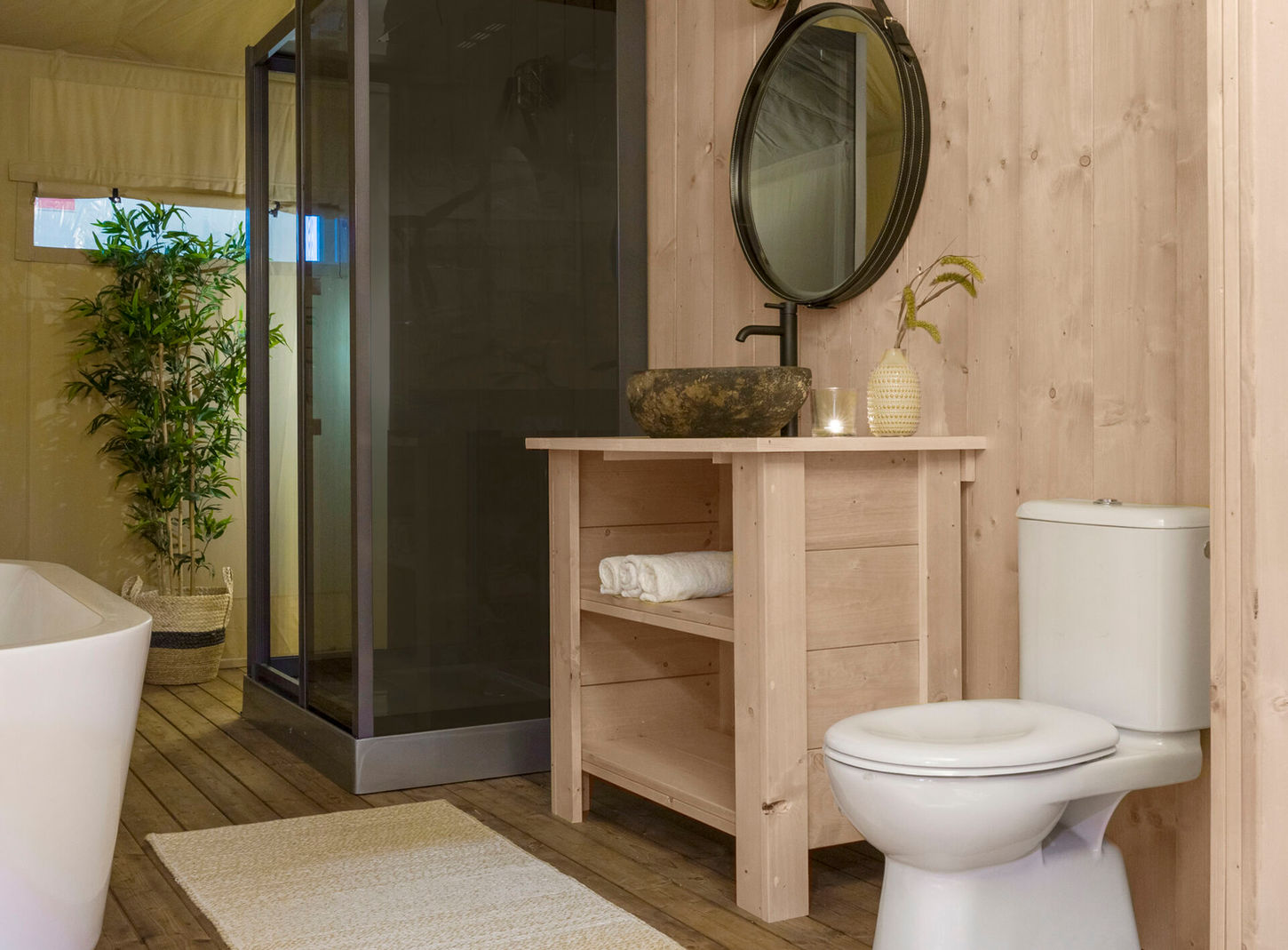 동남아시아의 집구조와 비슷한 스위트룸 텐트입니다. 추가 환기를 가능하게 하는 이중 지붕,